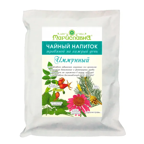 СОСТАВ: плоды шиповника, трава зверобоя, трава эхинацеи пурпурной, трава первоцвета, хвоя и почки сосны, лист крапивы двудомной, трава топинамбура, трава чабреца, лист смородины чёрной, лист земляники, лист облепихи, лист алычи, лист груши, лист яблони.
