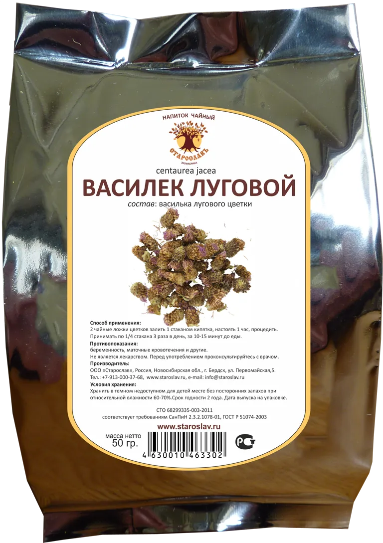 Водный настой корня василька помогает при диарее. Наружно настой цветков растения используют для принятия ванн при дерматологических заболеваниях, ревматизме. Распаренную траву растения прикладывают к очагам поражения при болях в мышцах, суставах, растяжении сухожилий.